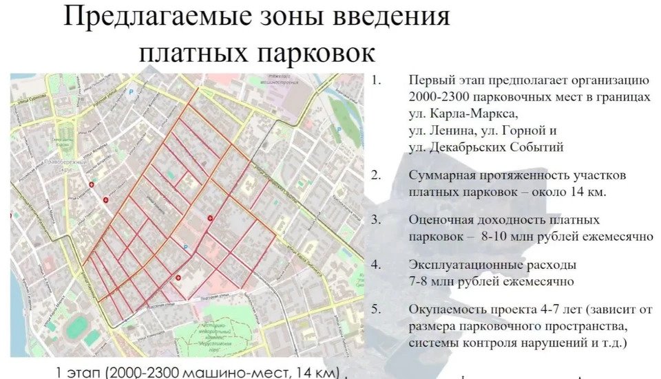Первый этап - организация 2000-2300 парковочных мест в границах улиц Карла Маркса, Ленина, Горной, Декабрьских Событий. На втором этапе планируют создать еще около 1800 мест на улицах от Польских Повстанцев до Карла Маркса, от Ленина и до Декабрьских Событий, также на участках улиц Карла Либкнехта и Партизанская, улицах Ямская, Подгорная.