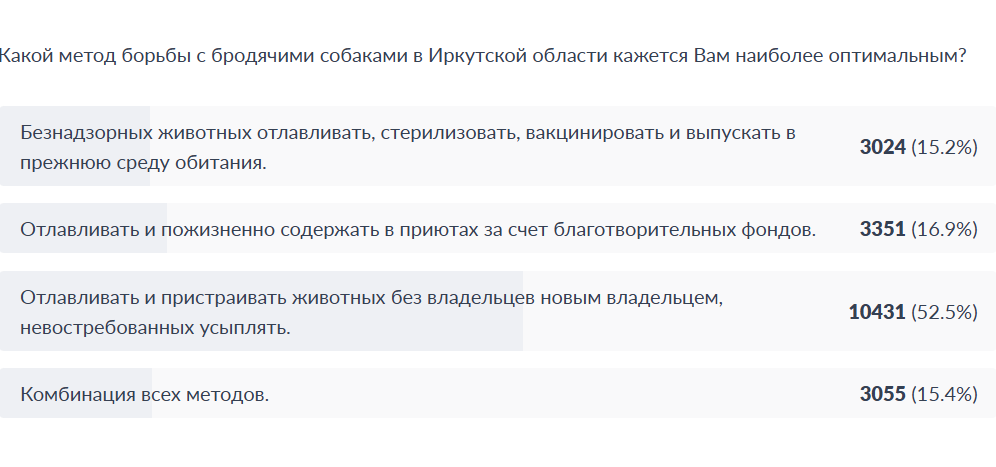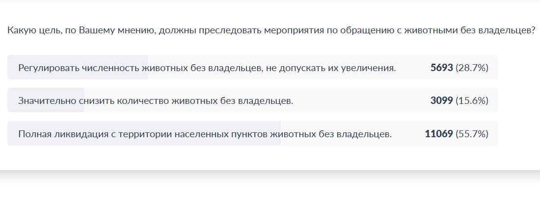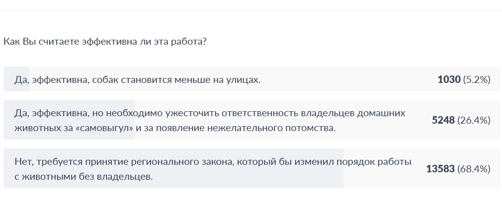 Еще раньше запустили опрос общественного мнения о регулировании сфере обращения с животными. Тогда 13,5 тысяч человек или 68.4% опрошенных решили, что закон необходимо принять. При этом более 10 тысяч человек (52%) высказались за пристраивание бездомных собак, и умерщвление тех, кто не может обрести семью.